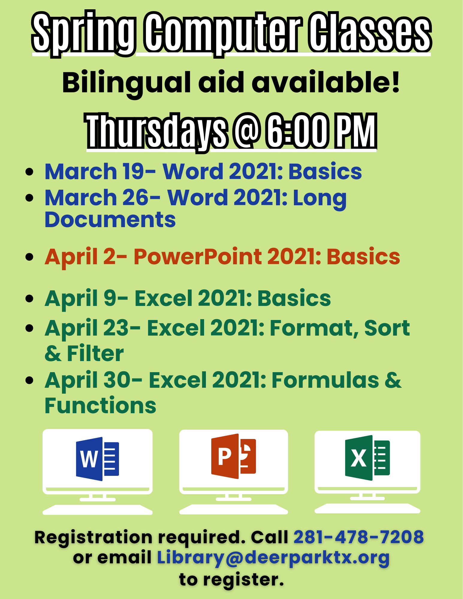 For more information or to register for a class, please call the Library at 281-478-7208.