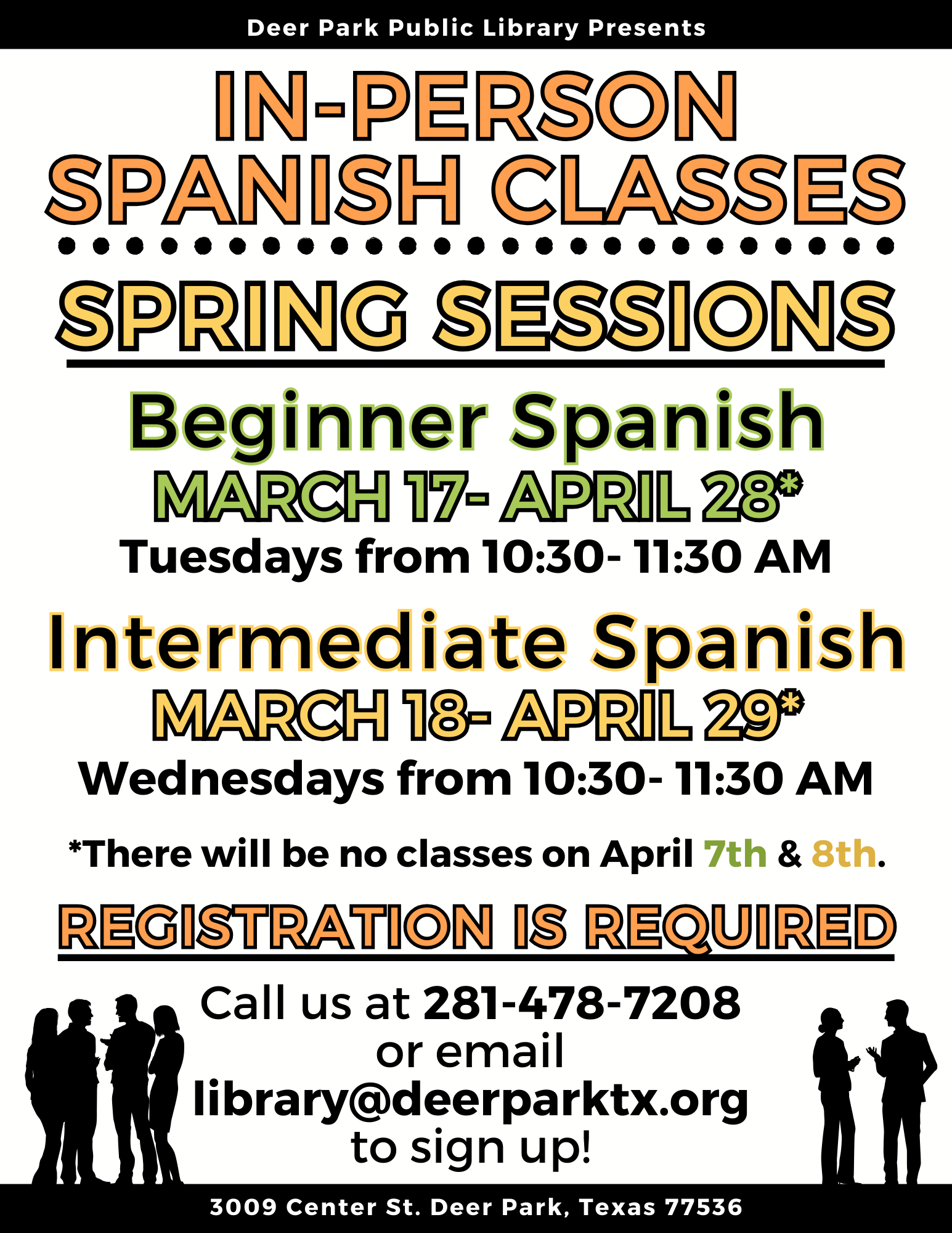 Free Spanish classes offered for both beginner and intermediate levels. Registration is required.